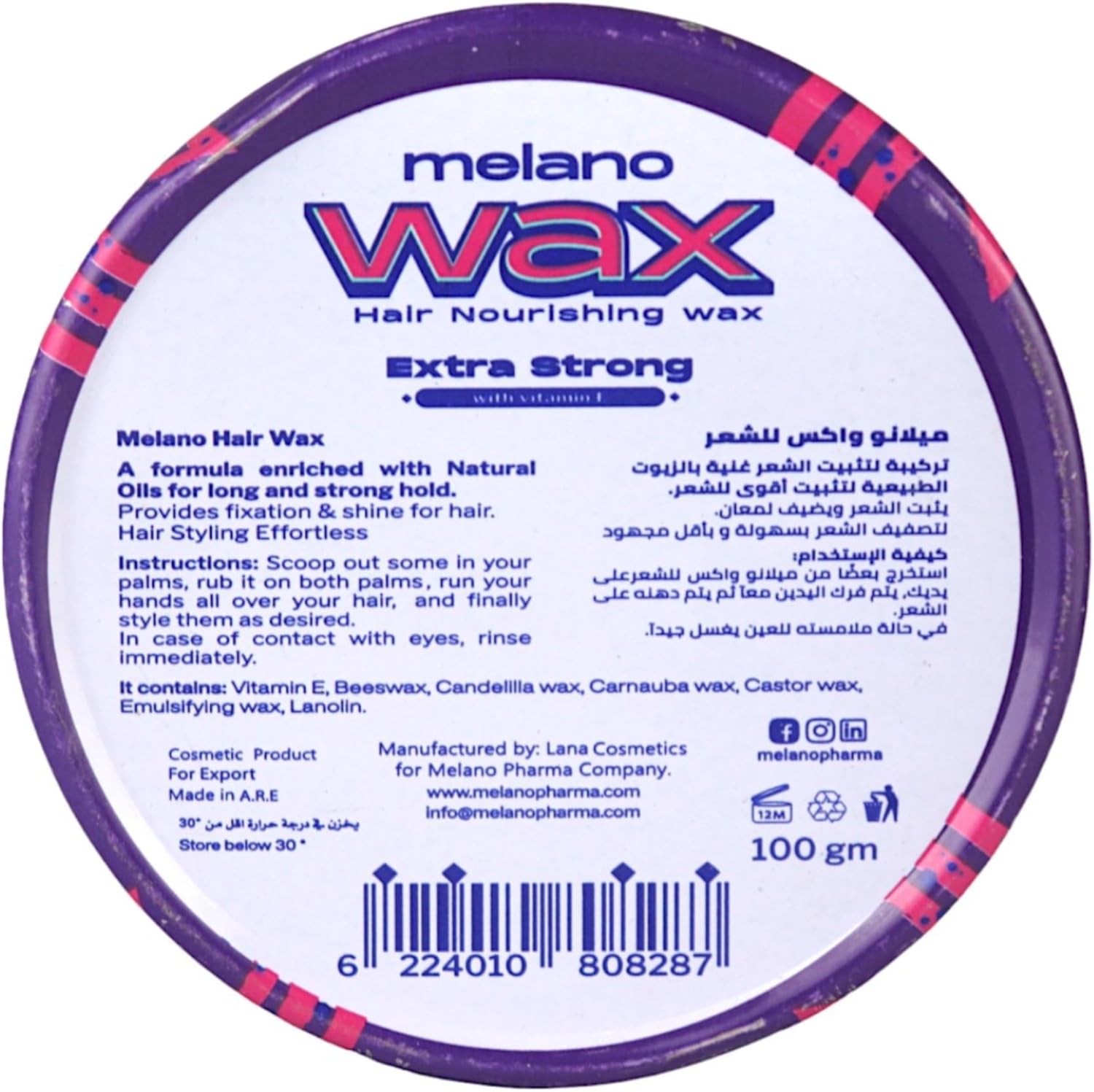 شمع تصفيف غني بالزيوت الطبيعية لتثبيت قوي يدوم طويلاً. يُضفي لمعاناً وتحديداً للشعر، مما يجعله سهل التصفيف. كيفية الاستخدام ضعي كمية مناسبة في راحة يديكِ، وافركيها بين راحتي يديكِ، ثم مرري يديكِ على شعركِ بالكامل، وصففيه كما ترغبين. المكونات فيتامين هـ، شمع العسل، شمع كانديليلا، شمع الكرنوبا، شمع مستحلب كاس، اللانولين. الحجم 100 مللى
